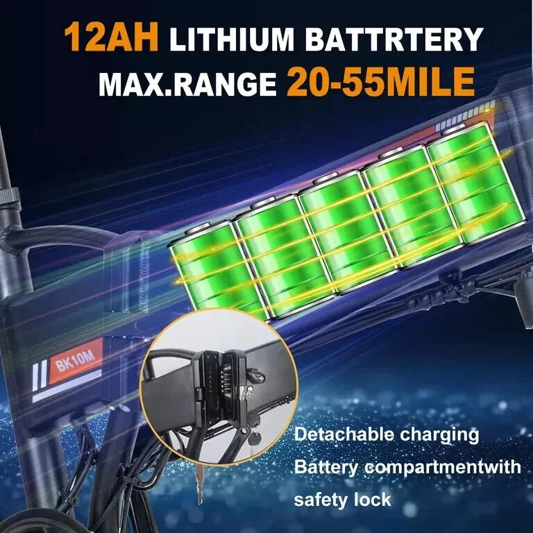 Maximum cruising range of 20-55miles with continuous pedal assistance, and it will vary according to individual weight and road conditions. BK10M has two charging methods, you can charge this folding electric bike directly, or take out the battery to charge.